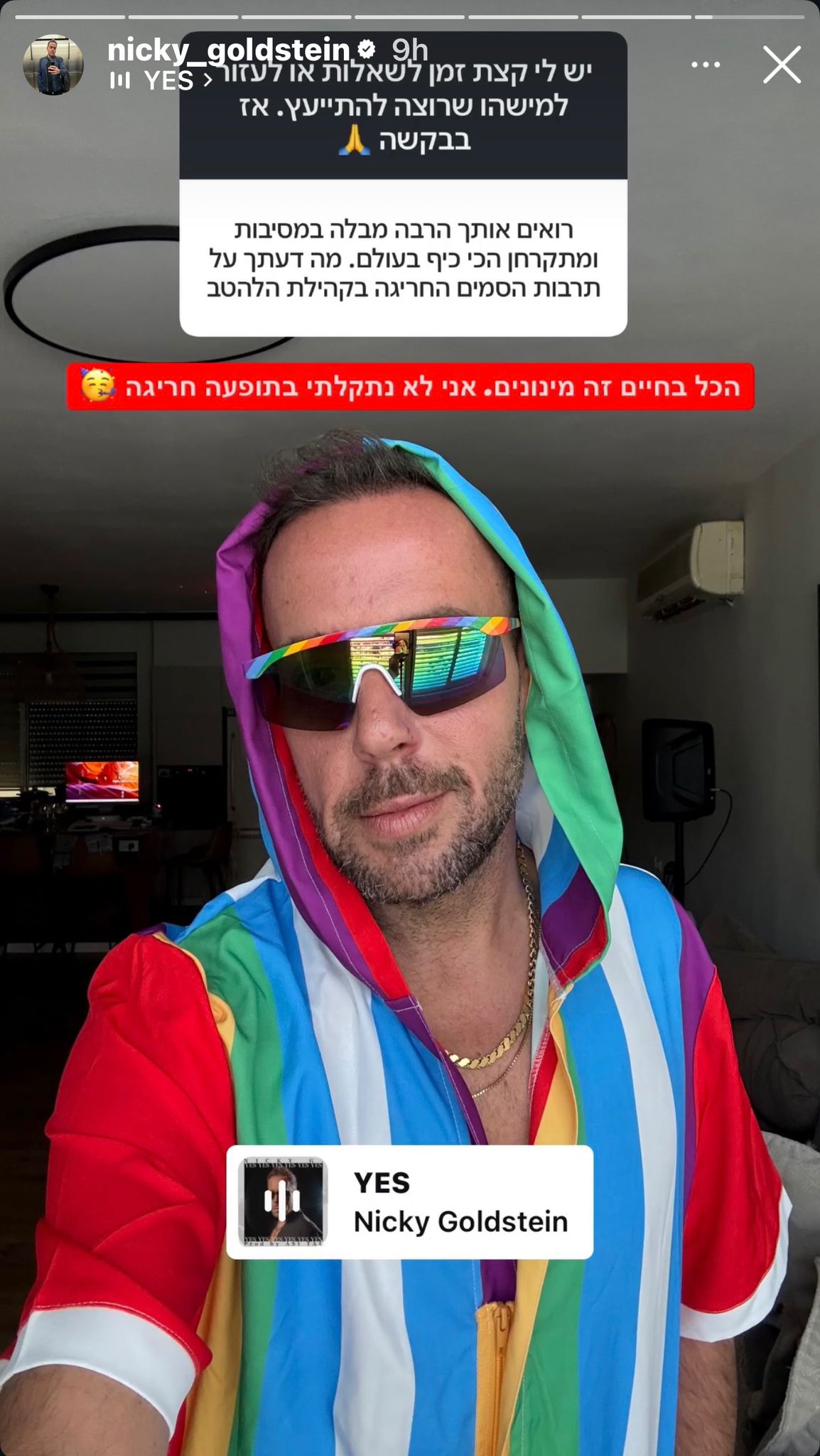 אך אמש (רביעי) העלה רצף סטוריז שאלות - תשובות לעמוד האינסטגרם שלו ונשאל על ידי אחד העוקבים: "רואים אותך הרבה מבלה במסיבות ו'מתקרחן' הכי כיף בעולם. מה דעתך על תרבות הסמים החריגה בקהילת הלהט"ב?" והשיב גולדשטיין: "הכל בחיים זה מינונים, אני לא נתקלתי בתופעה חריגה" וצירף אימוג'י מסיבה; צפו בסטורי.