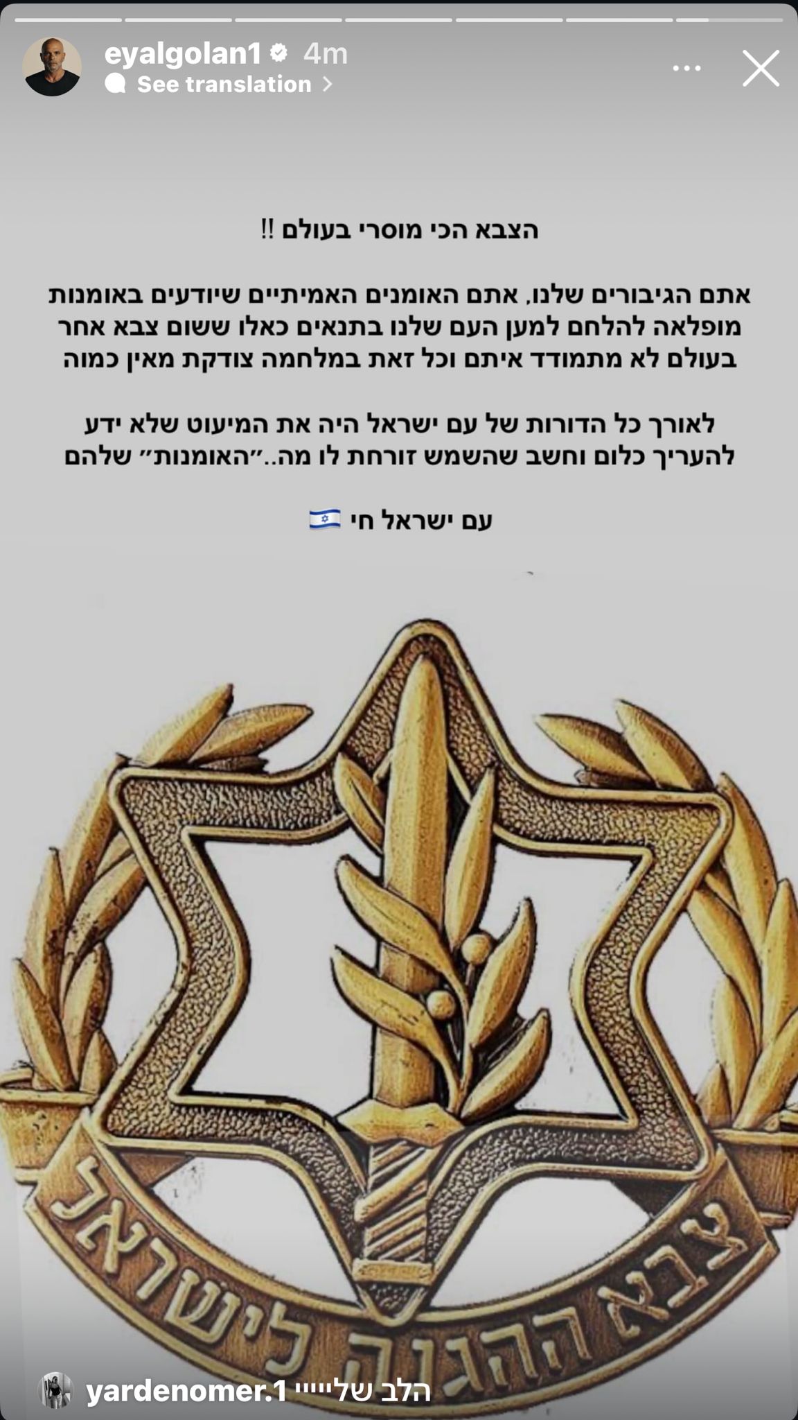 עוד הוסיף גולן: "לאורך כל הדורות של עם ישראל, היה את המיעוט שלא ידע להעריך כלום וחשב שהשמש זורחת לו מה… "האומנות" שלהם. עם ישראל חי"; צפו בסטורי.