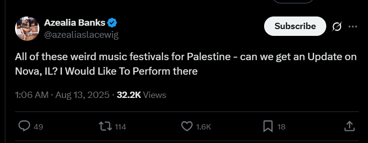 בציוץ שפרסמה הלילה ברשת X כתבה בנקס: "כל הקונצרטים והפסטיבלים המוזרים למען פלסטין - האם אני יכולה לקבל עדכון לגביי הנובה בישראל? אני אשמח להופיע שם".