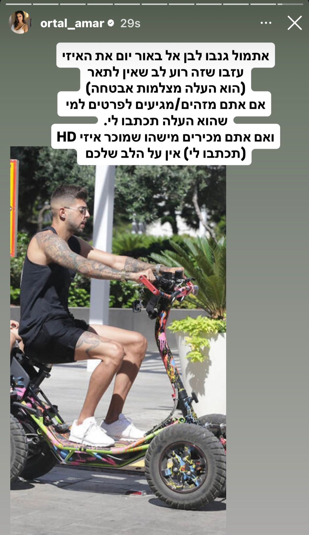 אל הדרמה הזאת, הגיבה היום האקסית ואם בנם אורטל עמר בסטורי: "אתמול גנבו לבן אל באור יום את האיזי, עזבו שזה רע לב שאין לתאר (הוא העלה מצלמות אבטחה), אם אתם מזהים/מגיעים לפרטים למי שהוא העלה, תכתבו לי. ואם אתם מכירים מישהו שמוכר "איזי HD" (תכתבו לי), אין על הלב שלכם"; צפו בסטורי.