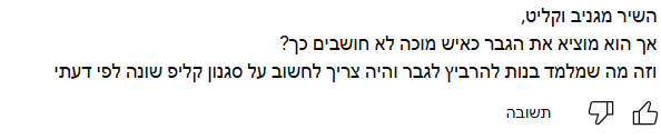 בין השאר נכתב "מעניין אם גבר היה גורר אישה על הרצפה או נותן לה אגרוף בבטן זה היה עובר על סדר היום". עוד נכתב "קליפ לא נעים לצפייה אחרי כל תאונות הדרכים הנוראיות שיש". גם בעמוד היוטיוב של הקליפ נכתב כי הוא "מוציא את הגבר כאיש מוכה".