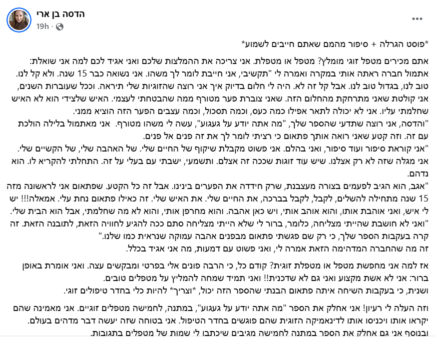 את הספר החדש הזה השיקה הדסה בן ארי, גרושתו של הזמר המפורסם חנן בן ארי, בתחילת השבוע, ונראה כי הוא כבר מעורר תגובות רבות. בעקבות שיחה שהייתה להדסה עם קוראת, היא שיתפה אותה כי הספר עזר לה להבין יותר טוב את הדינמיקה הזוגית עם בעלה. בן ארי החליטה להציע את הספר למטפלים זוגיים, בטענה כי הספר יכול לעזור במהלך הטיפול בקליניקה.