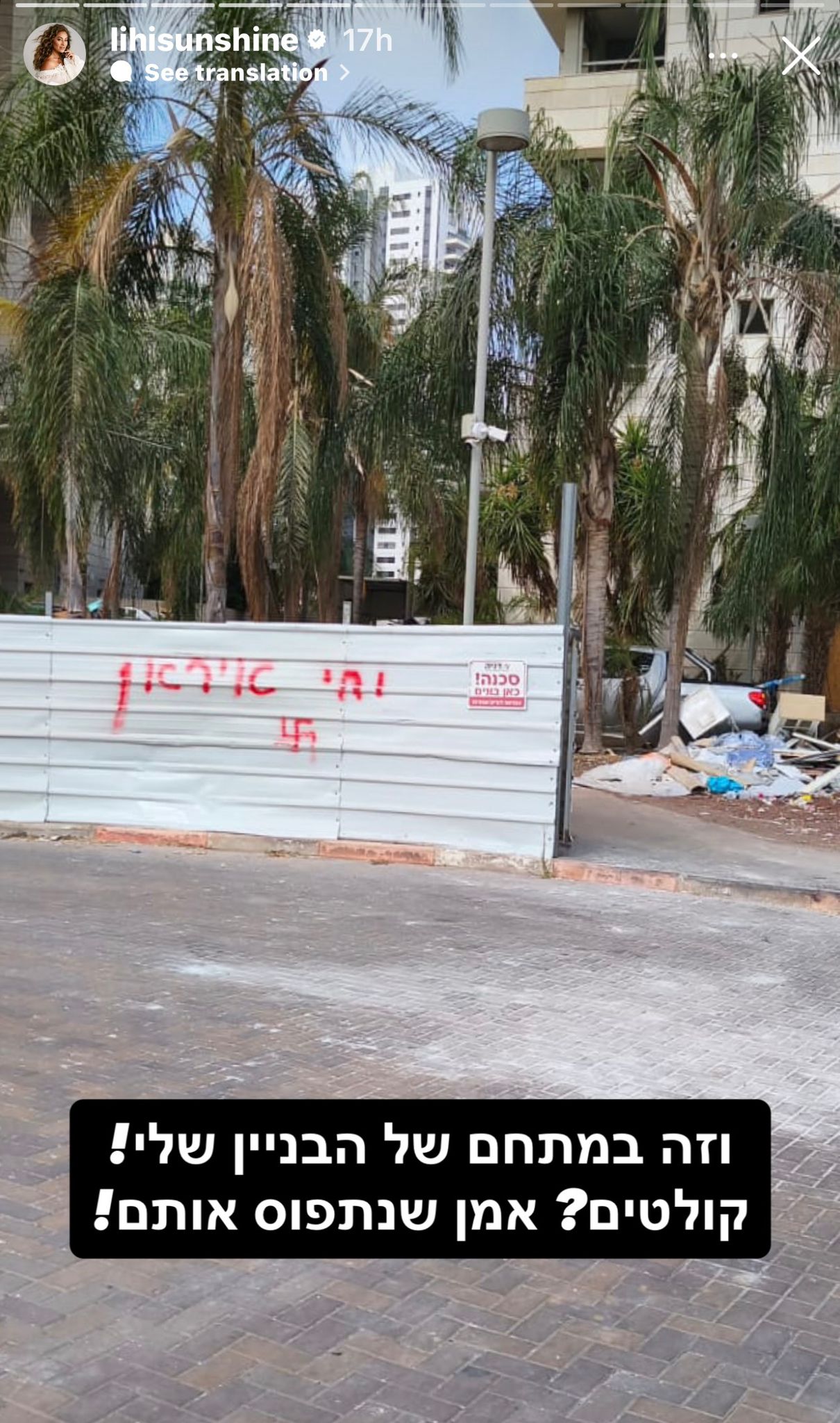 כוכבת הריאליטי ליהיא גרינר שביתה במגדל בפתח תקווה נפגע בעקבות טיל איראני, שיתפה אתמול (ראשון) בסטורי כיצד גורמים איראניים מטרידים את ביתה. בסטורי חדש שהעלתה נראה ריסוס גרפיטי עם המילים: "יחי איראן" וציור צלב קרס, בנוגע אליהם כתבה גרינר: "וזה במתחם הבניין שלי! קולטים? אמן שנתפוס אותם!; צפו.