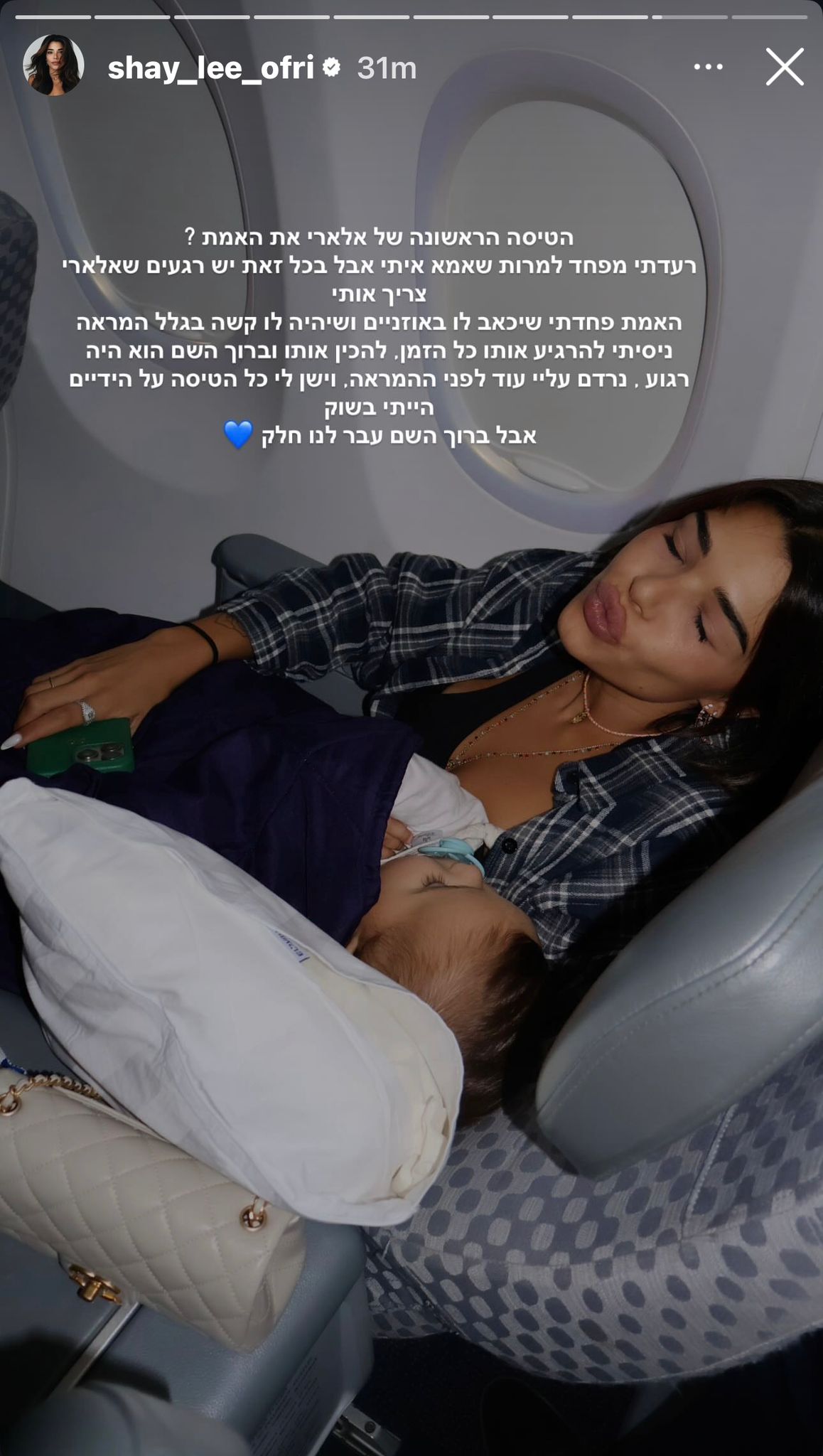 בסטורי חדש ששיתפה היום כתבה עופרי: "הטיסה הראשונה של אלארי את האמת? רעדתי מפחד למרות שאמא איתי, אבל בכל זאת יש רגעים שאלארי צריך אותי. האמת פחדתי שיכאב לו באוזניים ושיהיה לו קשה בגלל המראֶה".