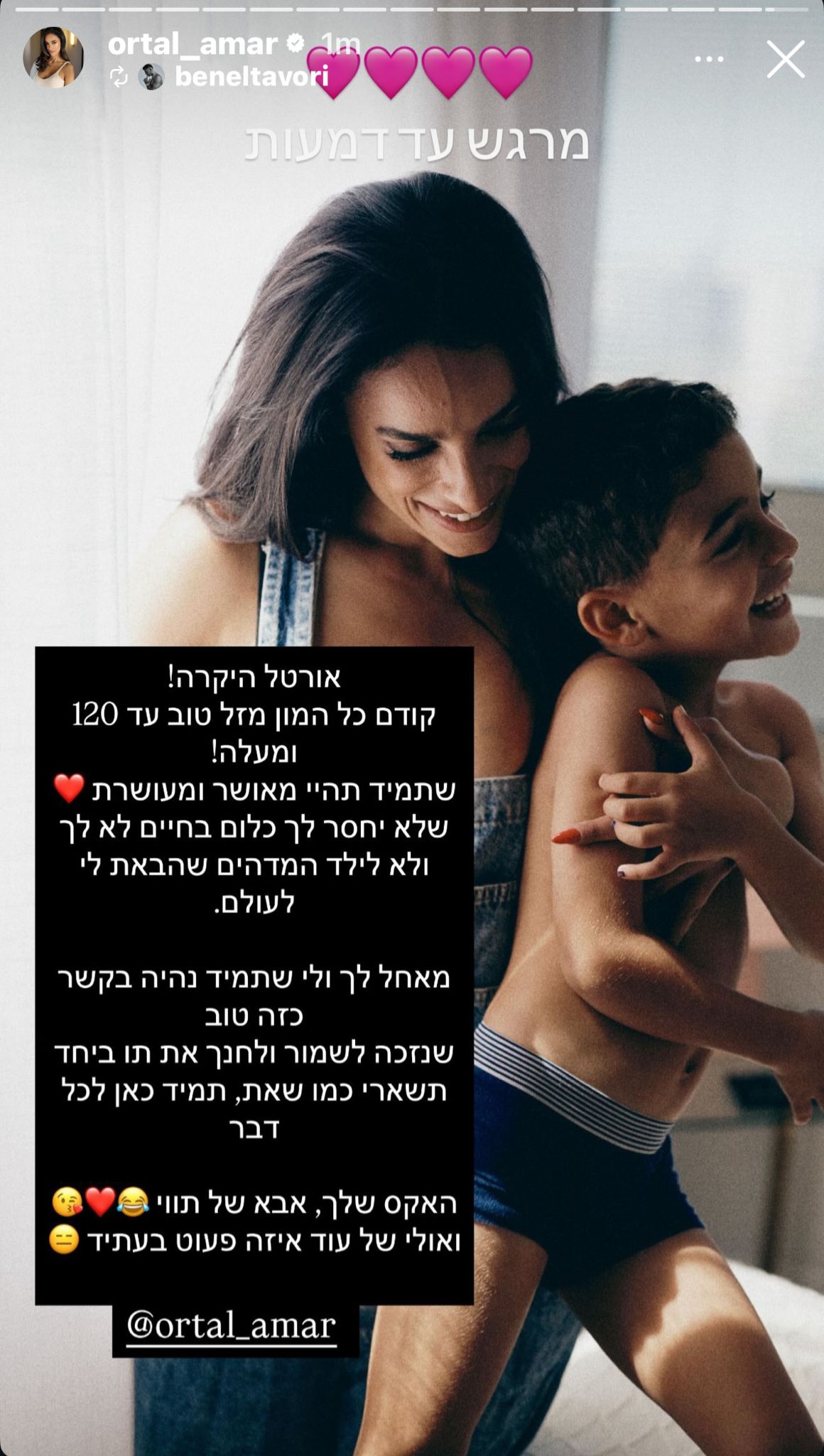 הבוקר (רביעי) עמר חוגגת יום הולדת 35, ותבורי בירך אותה ליום הולדתה בסטורי: "אורטל היקרה! קודם כל המון מזל טוב עד 120 ומעלה! שתמיד תהיי מאושרת ומועשרת, שלא יחסר לך כלום בחיים, לא לך ולא לילד המדהים שהבאת לי לעולם".