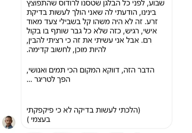 הוא הודה בפה מלא: "זה לא היה משהו קל בשבילי צעד מאוד אישי, רגיש, כזה שלא כל גבר משתף בו בקול רם. אבל אני עשיתי את זה כי רציתי להבין, להיות מוכן, לחשוב קדימה. הדבר הזה, דווקא המקום הכי תמים ואנושי, הפך לטריגר".