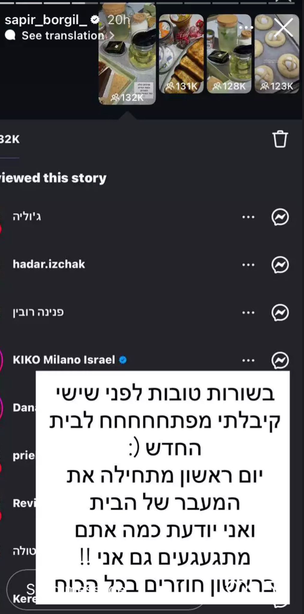 בסטורי במהלך סוף השבוע כתבה בנוגע לצעד החדש בחייה: "בשורות טובות לפני שישי. קיבלתי מפתח לבית החדש. יום ראשון מתחילה את המעבר של הבית, ואני יודעת כמה אתם מתגעגעים, וגם אני! בראשון חוזרים בכל הכוח!"; צפו בסטורי.