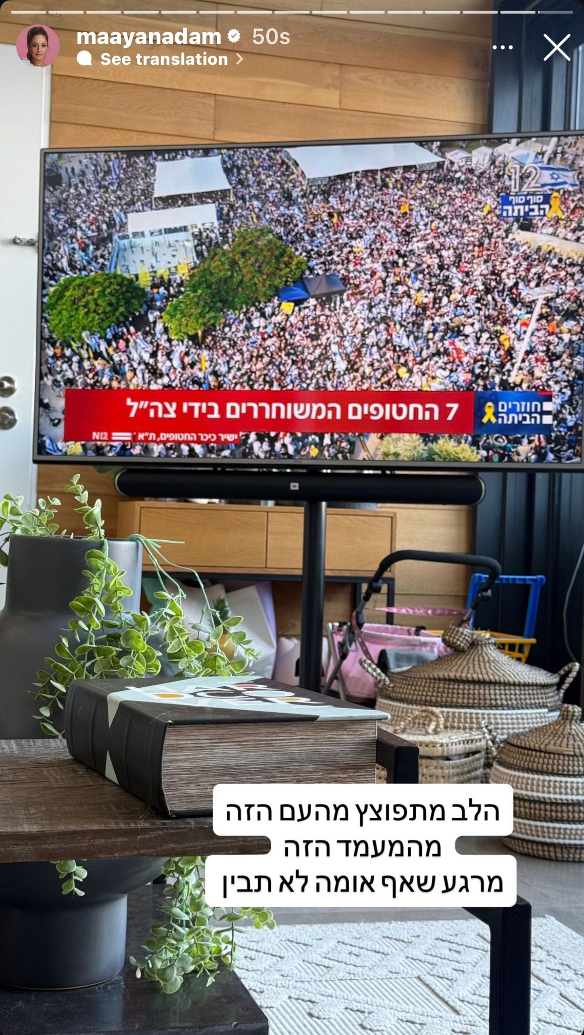 וגם המשפיענית מעיין אדם העלתה היום סטורי וכתבה: "הלב מתפוצץ מהעם הזה, מהמעמד הזה, מרגע שאף אומה לא תבין"; צפו בסטורי.