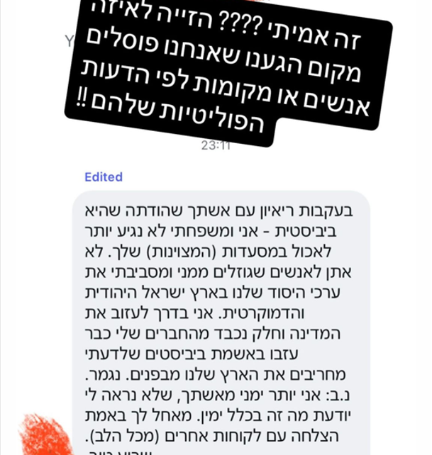4.ככה צריךהאנונימי 10/2025/26הגב לתגובה זו3 4אני לא חושב שזה דבר רע לפסול מקום על סמך דעות פוליטיות, זכותו המלאה של אדם לקבל החלטות, לא משנה מהי הסיבה לכךסגור