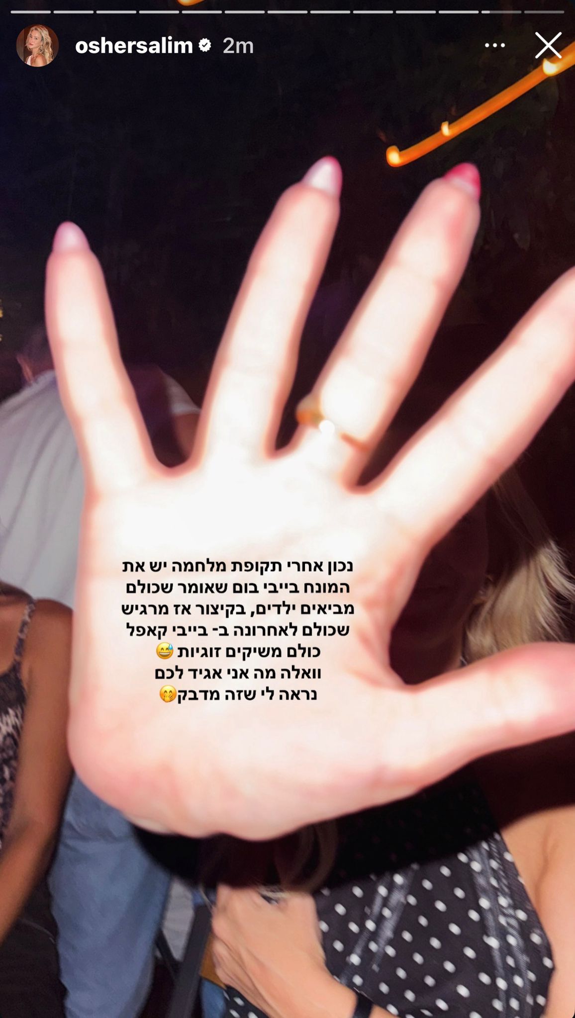 את הזוגיות, חשפה סלים בסטורי בעמוד האינסטגרם שלה, ושיתפה את תחושותיה בסטורי: "נכון אחרי תקופת מלחמה, יש את המונח בייבי בום שכולם מביאים ילדים, בקיצור אז מרגיש שכולם לאחרונה ב'בייבי קאפל', כולם משיקים זוגיות. וואלה מה אני אגיד לכם, נראה לי שזה מדבק"; צפו.