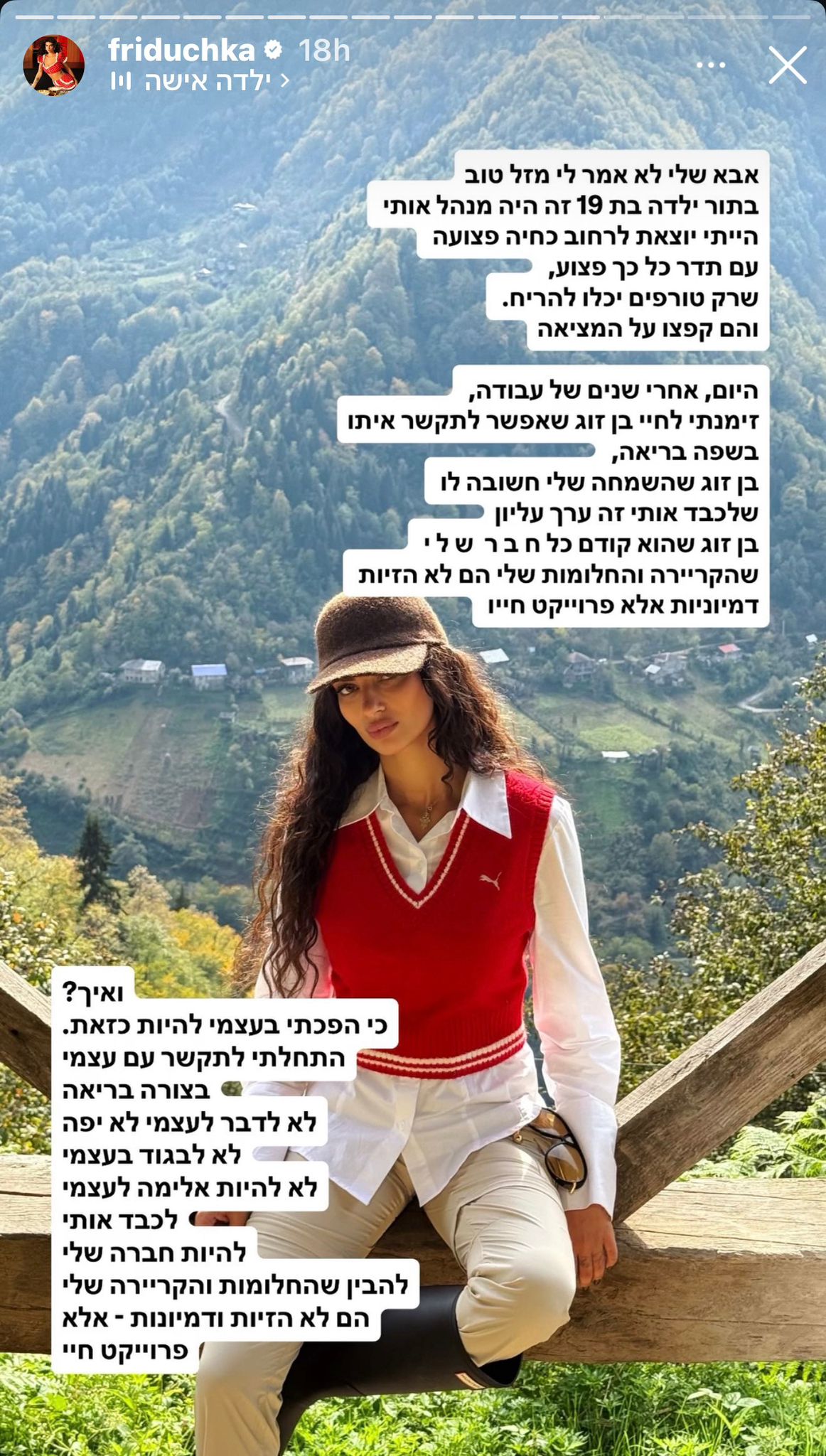 עוד הוסיפה: "היום, אחרי שנים של עבודה, זימנתי לחיי בן זוג שאפשר לתקשר איתו בשפה בריאה, בן זוג שהשמחה שלי חשובה לו, שלכבד אותי זה ערך עליון, בן זוג שהוא קודם כל חבר שלי, שהקריירה והחלומות שלי הם לא הזיות דמיוניות אלא פרויקט חייו. ואיך? כי הפכתי בעצמי להיות כזאת. התחלתי לתקשר עם עצמי בצורה בריאה, לא לדבר לעצמי לא יפה, לא לבגוד בעצמי, לא להיות אלימה לעצמי, לכבד אותי, להיות חברה שלי, להבין שהחלומות והקריירה שלי הם לא הזיות ודמיונות, אלא פרויקט חיי"; צפו בסטורי.