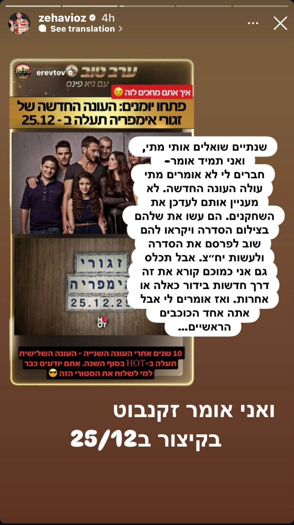 עוד הוסיף: "אבל תכלס גם אני כמוכם קורא את זה דרך חדשות בידור כאלה או אחרות. ואז אומרים לי אבל אתה אחד הכוכבים הראשיים... ואני אומר זקנבוט"; צפו בסטורי.