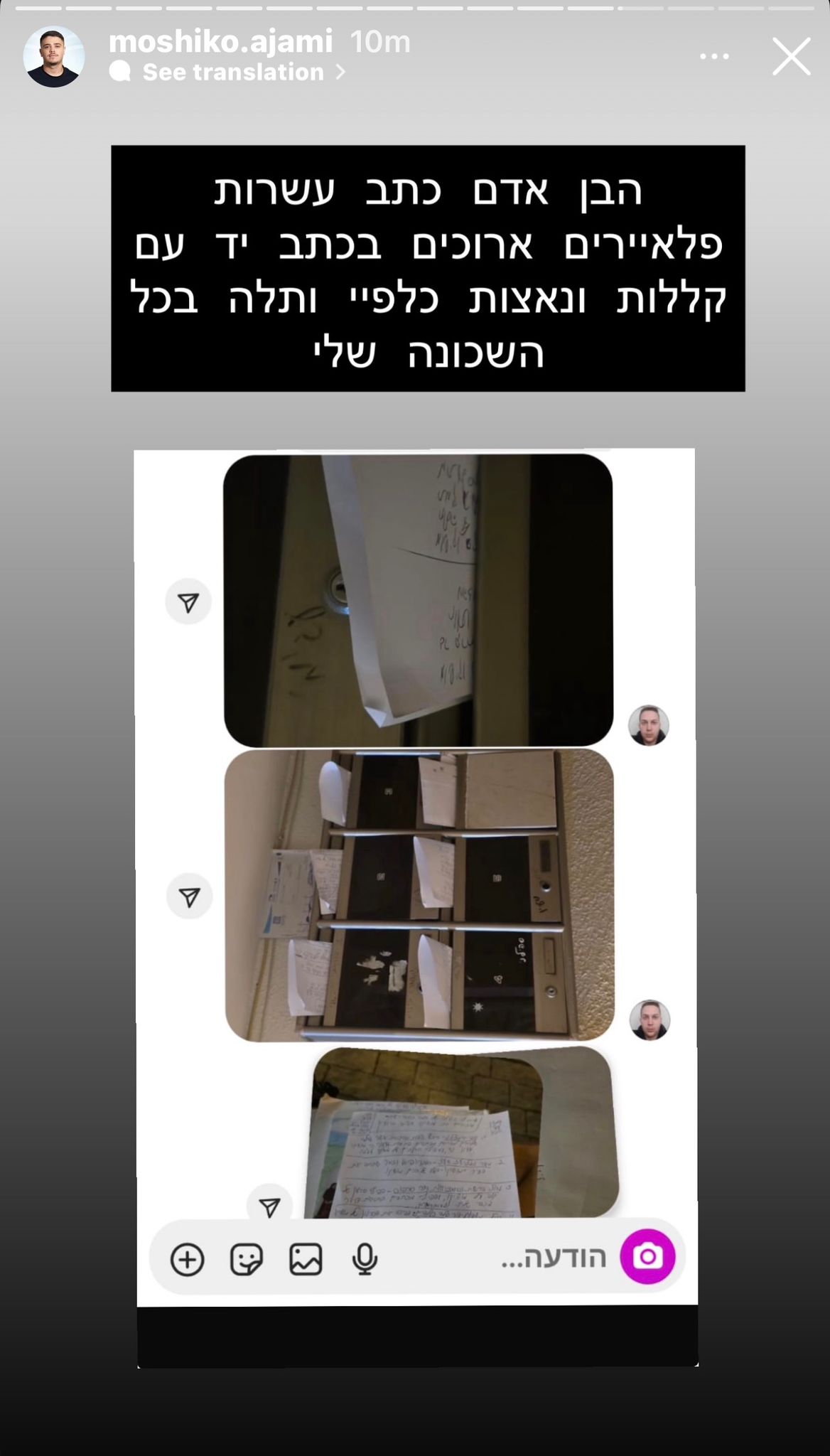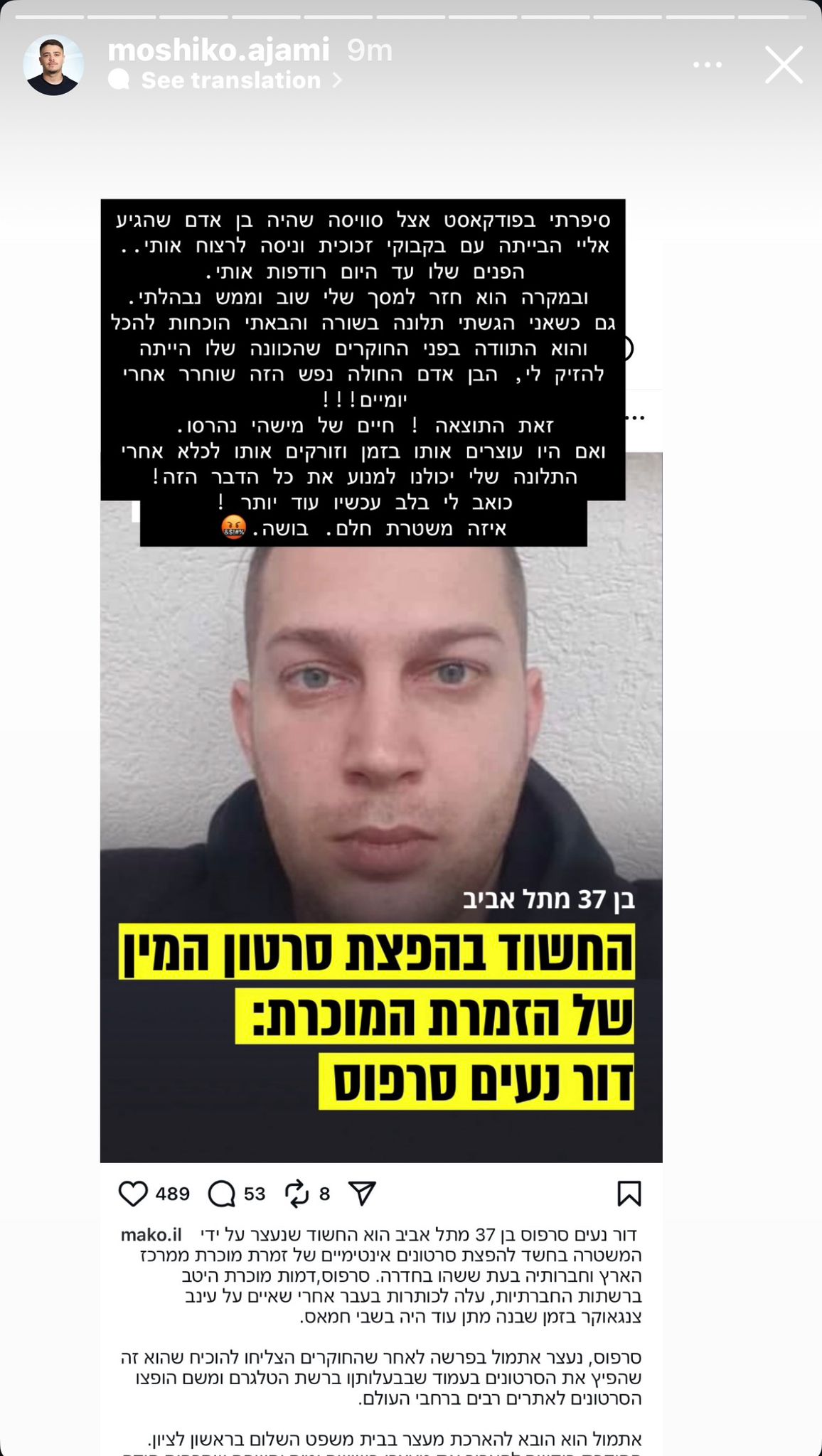 היום (חמישי) שיתף עג'מי בסטוריז בעמוד האינסטגרם שלו, איך האדם החשוד בהפצת הסרטונים של הזמרת המוכרת, הטריד אותו, כך כתב: "סיפרתי בפודקאסט אצל סויסה שהיה בן אדם שהגיע אליי הביתה עם בקבוקי זכוכית וניסה לרצוח אותי. הפנים שלו עד היום רודפות אותי.