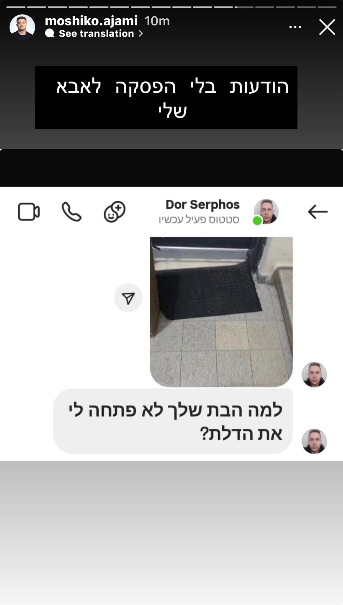 עוד הוסיף: "זאת התוצאה! חיים של מישהי נהרסו. ואם היו עוצרים אותו בזמן, וזורקים אותו לכלא אחרי התלונה שלי, יכולנו למנוע את כל הדבר הזה! כואב לי בלב עכשיו עוד יותר! איזה משטרת חלם, בושה"; צפו בסטורי.