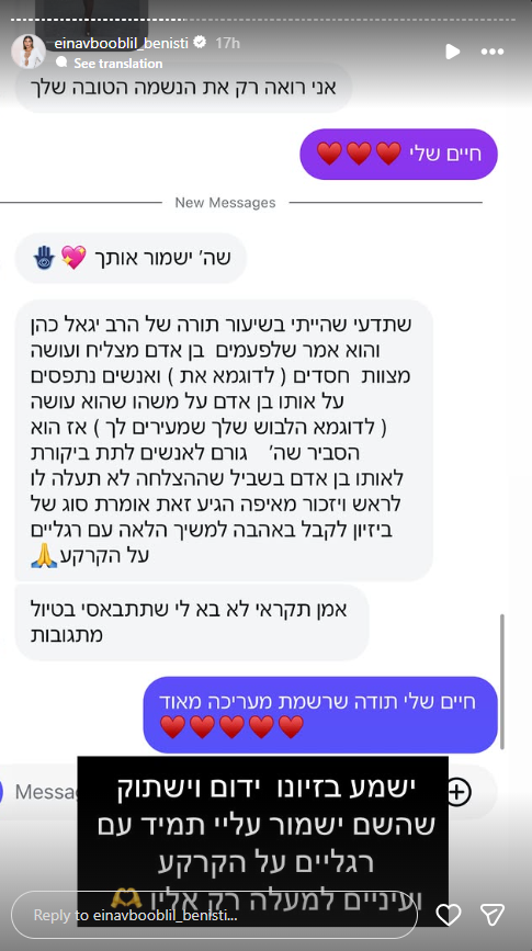 בהמשך, שיתפה הודעה שקיבלה מעוקבת נוספת שכתבה לה: "הייתי בשיעור תורה של הרב יגאל כהן והוא אמר שלפעמים אדם מנסה לעשות מצוות ואנשים נתפסים על משהו שהוא עשה (למשל הלבוש שלך שמעירים לך עליו). אז הוא הסביר שה' גורם לאנשים לתת ביקורות לאותו אדם בשביל שההצלחה לא תעלה לו לראש ויזכור מאיפה זה הגיע, זאת אומרת סוג של ביזיון לקבל באהבה כדי להמשיך הלאה עם רגליים על הקרקע".