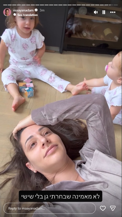 אבל נראה שלא הכל עובר חלק. אדם שיתפה סטורי בחשבון האינסטגרם שלה, אליו צירפה תמונה שלה שוכבת על רצפת ביתה בזמן ששתי בנותיה משחקות מאחוריה, כשהיא נראית מיואשת וכתבה ברקע: "לא מאמינה שבחרתי גן בלי שישי".