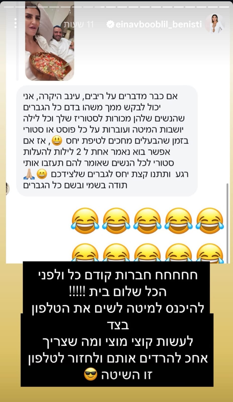 "אם כבר מדברים על ריבים, עינב היקרה, אני יכול לבקש ממך משהו בדם? כל הגברים שהנשים שלהם מכורות לסטוריז שלך וכל לילה יושבות על המיטה ועוברות על כל פוסט או סטורי בזמן שהבעלים מחכים לטיפה יחס, אז אם אפשר, בוא נאמר אחת ל-2 לילות להעלות סטורי לכל הנשים שאומר להן תעזבו אותי רגע ותתנו קצת יחס לגברים שלצידכן. תודה בשמי ובשם כל הגברים".
