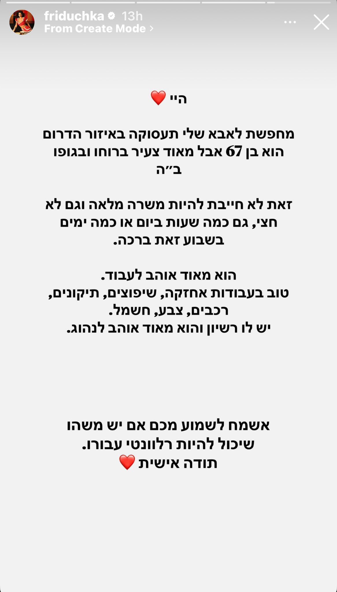 עוד הוסיפה: "זאת לא חייבת להיות משרה מלאה וגם לא חצי, גם כמה שעות ביום או כמה ימים בשבוע זה ברכה. הוא מאוד אוהב לעבוד. טוב בעבודות אחזקה, שיפוצים, תיקונים, רכבים, צבע, חשמל. יש לו רישיון והוא מאוד אוהב לנהוג. אשמח לשמוע מכם אם יש משהו שיכול להיות רלוונטי עבורו"; צפו בסטורי.