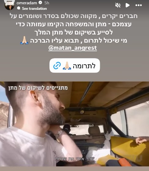 הזמר עומר אדם פרסם היום (שני) סטורי באינסטגרם שלו, שבו פנה לקהל עוקביו בבקשה לתמוך כלכלית בחייל שורד השבי מתן אנגרסט: "חברים יקרים, מקווה שכולם בסדר ושומרים על עצמכם", כתב אדם, "מתן והמשפחה הקימו עמותה כדי לסייע בשיקום של מתן המלך. מי שיכול לתרום, תבוא עליו הברכה".