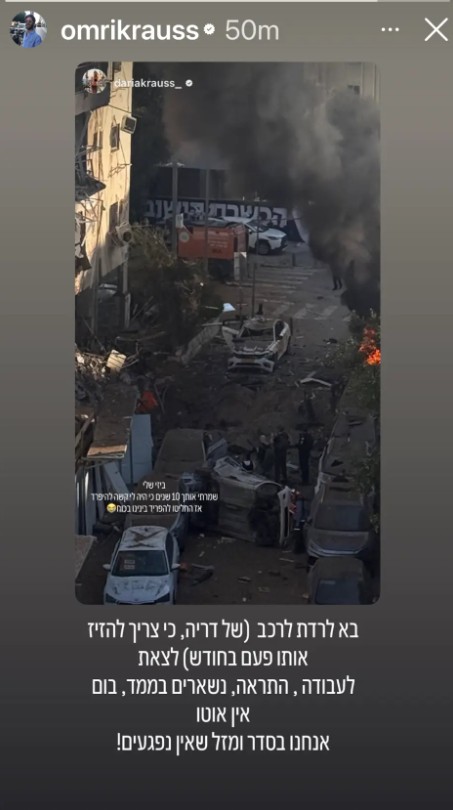 קראוס שיתף על הרגעים הדרמטיים עם סטורי שהעלה לחשבון האינסטגרם שלו, אליו צירף תמונה של הנזק העצום שהתרחש מחוץ לביתו אחרי שהטיל שרף את הרכב שלו כליל וכתב ברקע: "ביזי שלי, שמרתי אותך 10 שנים כי היה לי קשה להיפרד, אז החליטו להפריד בינינו בכוח".