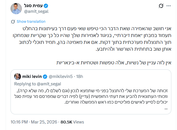 כתבת הסלבס של TMI במעריב, מיקי לוין, חוטפת ביקורת קשה מפרשן חדשות 12, עמית סגל, לאחר שמערכת מעריב נאלצה להתנצל על כתבה נגד העיתונאי, והקרב בין השניים המשיך גם לרשת החברתית: "את הדבר הכי טיפש שאי פעם דרך בעיתונות", ואיך הגיבה לו מיקי לוין? הקרב החם של רשת X