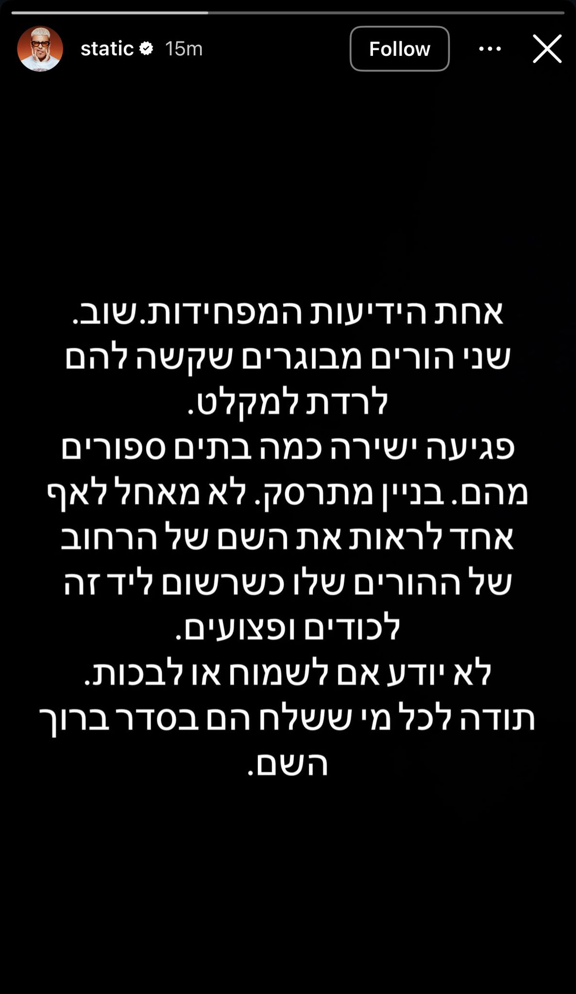 אחד הזמרים האהובים, סטטיק שיתף ברגעי הפחד. "אחת הידיעות המפחידות. שוב", כתב בחשבון האינסטגרם שלו. "שני הורים מבוגרים שקשה להם לרדת למקלט. פגיעה ישירה כמה בתים ספורים מהם, בניין מתרסק", הוסיף הזמר.
