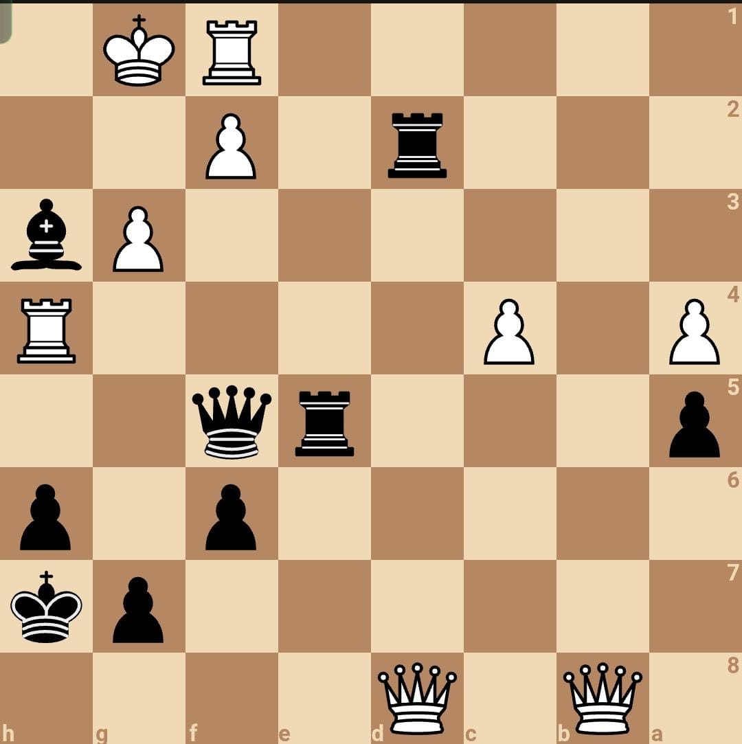 37… מה:ו2!! – הקרבה שלא רואים כל יום. למרות שללבן היו שתי מלכות על הלוח, השחור בחר במהלך שכלל הקרבת מלכה עם סיום מדהים: