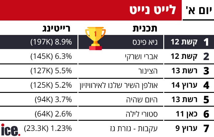 ברצועת הלייט נייט, "גיא פינס" בקשת 12 מוביל עם 8.9% רייטינג (197 אלף צופים), במקום השני "אברי ושרקי" בקשת 12 עם 6.3% (145 אלף צופים), במקום השלישי "הצינור" ברשת 13 עם 5.5% (127 אלף צופים), במקום הרביעי "אולפן השיר שלנו לאירוויזיון" בערוץ 14 עם 5.2% (125 אלף צופים), במקום החמישי "היום שהיה" ברשת 13 עם 3.7% (94 אלף צופים), במקום השישי "סטורי לילה" בכאן 11 עם 2.6% (64 אלף צופים), ובמקום השביעי "עקבות - נורית גז" בערוץ 9 עם 1.23% (23.3 אלף צופים).