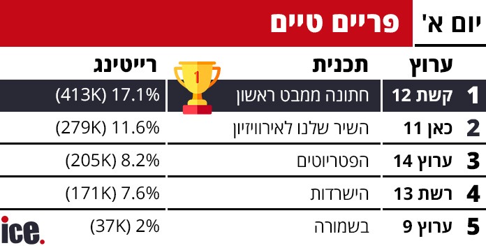 גם בפריים טיים נהנית קשת 12 מהצלחה מסחררת כאשר "חתונה ממבט ראשון" מובילה עם 17.1% רייטינג (413 אלף צופים). במקום השני נמצאת התוכנית "השיר שלנו לאירוויזיון" בכאן 11 עם 11.6% (279 אלף צופים) - הישג מרשים לערוץ הציבורי. במקום השלישי "הפטריוטים" בערוץ 14 עם 8.2% (205 אלף צופים), במקום הרביעי "הישרדות" ברשת 13 עם 7.6% (171 אלף צופים), ובמקום החמישי "בשמורה" בערוץ 9 עם 2% (37 אלף צופים).