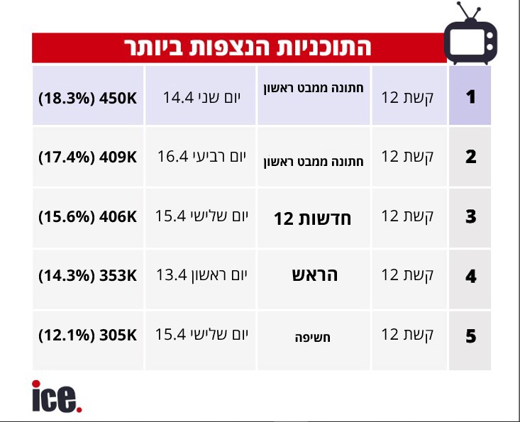 כמו בכל שבוע, תכניות קשת 12 תופסות את המקומות הראשונים של טבלאות הרייטינג. השיא של השבוע היה תכנית השידוכים האהובה, "חתונה ממבט ראשון" שסחפה ישראליים רבים