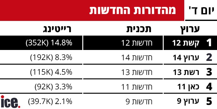 מהדורות החדשות מציגות נתוני צפייה מרשימים, כאשר "חדשות 12" מובילה עם 352 אלף צופים (14.8%). במקום השני ניצבת "חדשות 14" עם 192 אלף צופים (8.3%), אחריה "חדשות 13" עם 115 אלף צופים (4.5%), "חדשות 11" עם 92 אלף צופים (3.3%), ו"חדשות 9" במקום החמישי עם 39.7 אלף צופים (2.1%).
