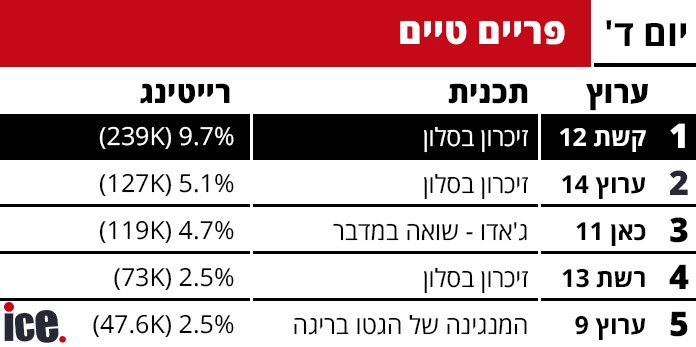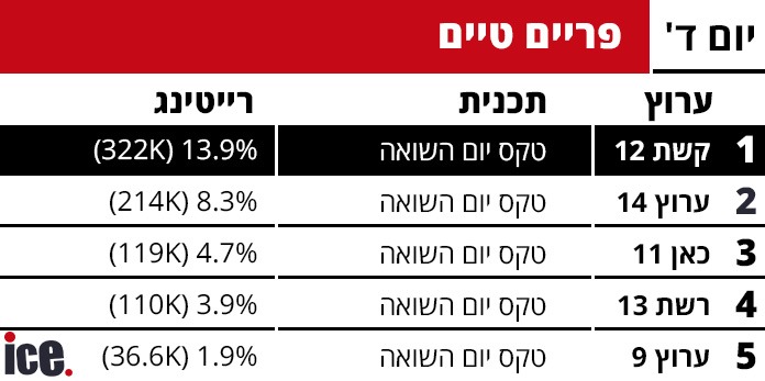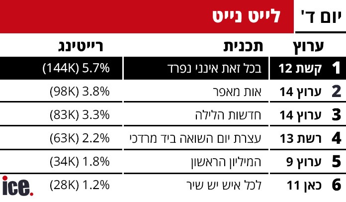 על פי נתוני הרייטינג מליל אמש (רביעי), ערב יום השואה. שוב ניתן לראות את התפלגות הצפייה ברצועות השידור השונות בטלוויזיה הישראלית. מרבית הצופים בחרו בקשת 12 וחדשות 12 כדי להתעדכן בסיפורים המרגשים.