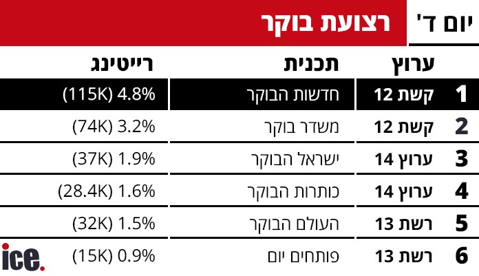 בשידורי הבוקר, "חדשות הבוקר" בקשת 12 הובילה עם 115 אלף צופים (4.8%), במקום השני "משדר בוקר" בקשת 12 עם 74 אלף צופים (3.2%), במקום השלישי "ישראל הבוקר" בערוץ 14 עם 37 אלף צופים (1.9%), אחריו "כותרות הבוקר" בערוץ 14 עם 28.4 אלף צופים (1.6%), במקום החמישי "העולם הבוקר" ברשת 13 עם 32 אלף צופים (1.5%), ובמקום השישי "פותחים יום" ברשת 13 עם 15 אלף צופים (0.9%).