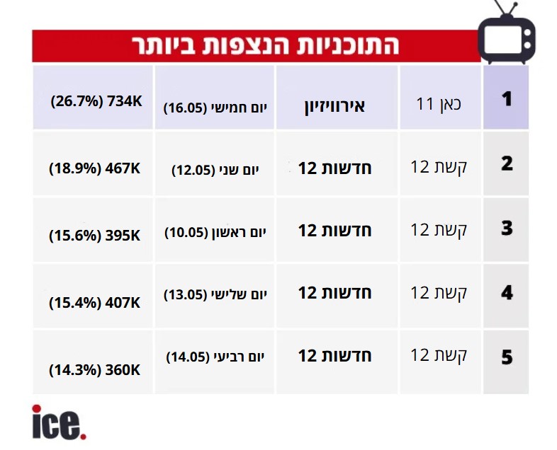 כאמור, התוכנית היחידה השבוע שהיא לא מהדורת החדשות של קשת 12 שנכנסה לדירוג השבועי היא שידור האירוויזיון שדורג במקום הראשון. הנתונים נכונים לעת בה יובל רפאל, נציגת ישראל לארוויזיון שהיא גם ניצולת הטבח במסיבת הנובה, הופיעה על הבמה הגדולה בעולם עם ביצוע מרשים במיוחד, שאף העפיל לגמר שישודר במוצאי שבת.