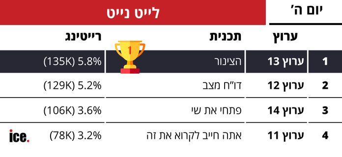 ברצועת הלייט נייט "הצינור" כובשת את המקום הראשון עם 5.8% ו-135 אלף צופים, כש"דו"ח מצב" של 12-שהתרגלה להיות במקום הראשון-ירדה למקום השני. "פתחי את שי" של 14 במקום השלישי (3.6%), וסוגרת את הרשימה "אתה חייב לקרוא את זה" של כאן 11.