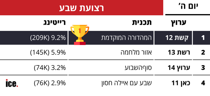 ברצועת שבע המהדורה המוקדמת של קשת 12 עם 9.2% ו-209 אלף צופים, ו"אזור מלחמה" של רשת 13 עם 5.9% ו- 145 אלף צופים. סוגרים את הרשימה ערוץ 14 עם "סופהשבוע" (3.2%) ו"שבע עם איילה חסון של כאן 11 (2.9%).