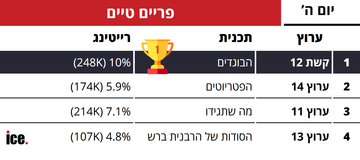 ברצועת הפריים טיים פרק סיום העונה של הבוגדים בקשת 12 הביא 10% ו-248 אלף צופים, וסגר עונה שהתחילה בקול תרועה רמה והמשיכה בנתונים בינוניים למדי. במקום השני "הפטריוטים" מערוץ 14 הביאו 5.9% ו-174 אלף צופים, כשכאן 11 התמקם עם "מה שתגידו" במקום השלישי. "הסודות של הרבנית ברש" מערוץ 13 סוגר את הרשימה עם 4.8% ו-107 אלף צופים.