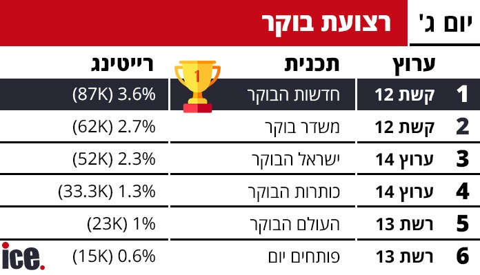 בשעות הבוקר, ערוץ 12 הציג את השליטה עם חדשות הבוקר שרשמו 87 אלף צופים (3.6%). משדר בוקר באותו הערוץ הגיע למקום השני עם 62 אלף צופים (2.7%). ישראל הבוקר בערוץ 14 רשם 52 אלף צופים (2.3%), בעוד כותרות הבוקר באותו הערוץ הגיעה ל-33.3 אלף צופים (1.3%). העולם הבוקר בערוץ 13 רשם 23 אלף צופים (1%), ופותחים יום ב-i24NEWS סגר עם 15 אלף צופים (0.6%).