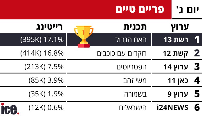 בפריים טיים, האח הגדול בערוץ 13 שלט בפער קטן מהמתחרים עם 395 אלף צופים (17.1%), מה שמעיד על הכוח העצום של הריאליטי בשעות הפריים. רוקדים עם כוכבים בערוץ 12 הגיע למקום השני