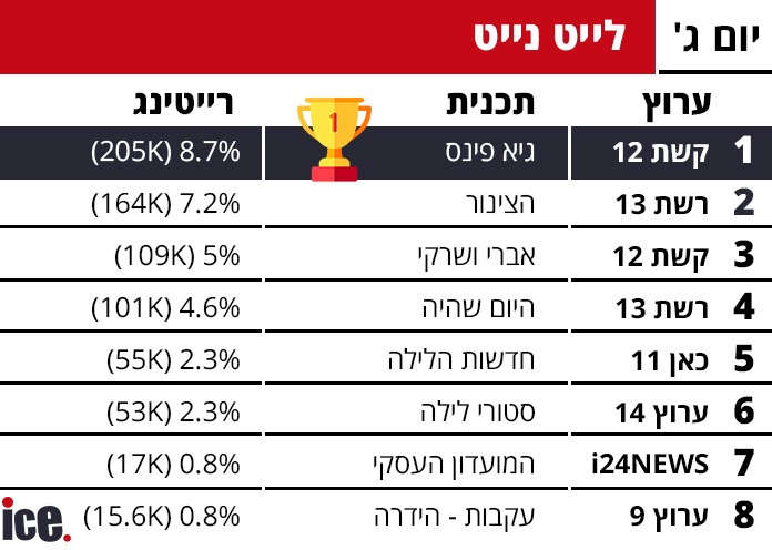 בשעות הלילה המאוחרות, גיא פינס בערוץ קשת 12 הוביל עם 205 אלף צופים (8.7%), מה שמעיד על נאמנות הצופים לתכנית הבידור הלילית. הצינור בערוץ 13 הגיע למקום השני עם 164 אלף צופים (7.2%), בעוד אברי ושרקי בערוץ 12 רשמו 109 אלף צופים (5%). היום שהיה בערוץ 13 הגיע ל-101 אלף צופים (4.6%), חדשות הלילה בערוץ 11 רשמו 55 אלף צופים (2.3%), וסטורי לילה בערוץ 14 הגיע לאותו מספר עם 53 אלף צופים (2.3%). המועדון העסקי ב-i24NEWS רשם 17 אלף צופים (0.8%), בעוד עקבות בערוץ 9 סגרה עם 15.6 אלף צופים (0.8%).