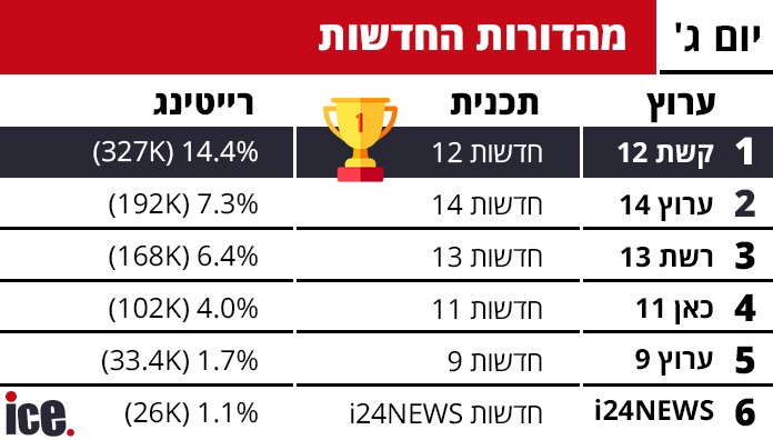 בשעות החדשות המרכזיות, חדשות 12 הובילו בביטחון עם 327 אלף צופים (14.4%), מה שמחזק את מעמדו של הערוץ הציבורי כמקור החדשות המועדף. חדשות 14 הגיעו למקום השני עם 192 אלף צופים (7.3%), בעוד חדשות 13 רשמו 168 אלף צופים (6.4%). חדשות 11 הגיעו ל-102 אלף צופים (4.0%), חדשות 9 רשמו 33.4 אלף צופים (1.7%), וחדשות i24NEWS סגרו עם 26 אלף צופים (1.1%).