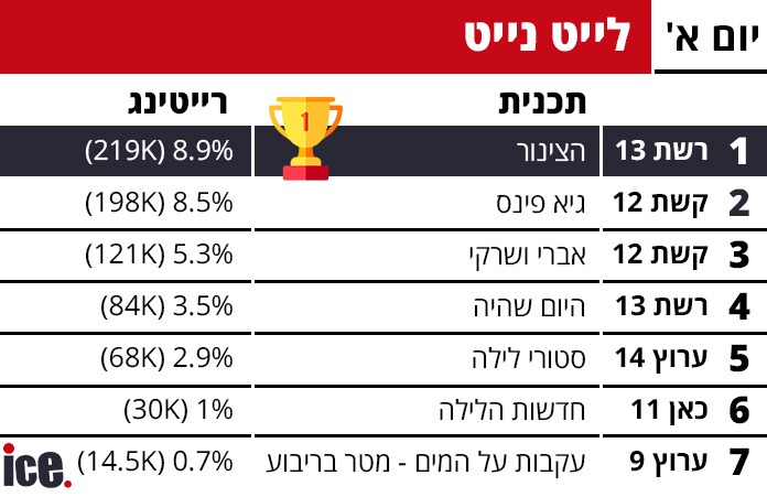 בפריים טיים רשת 13 עם ניצחון מוחץ עם תוכנית "האח הגדול" שהגיעה לרייטינג מרשים של 16.6% ו-408 אלף צופים. מקום שני תפסה תוכנית "רוקדים עם כוכבים" בקשת 12 עם 15.9% ו-394 אלף צופים, ומה עשו ינון מגל והחברים בערוץ 14?