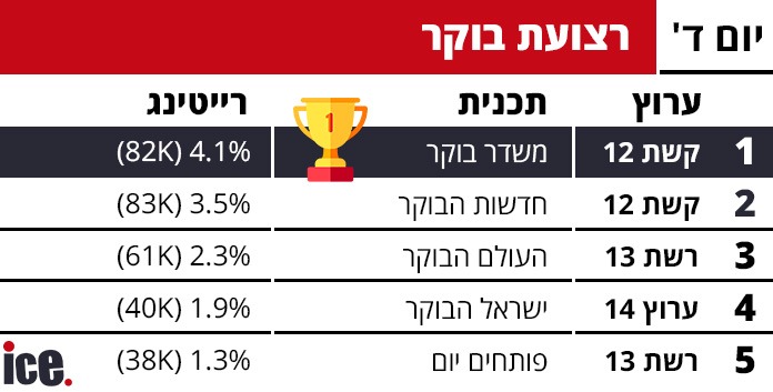 ברצועת הבוקר קשת 12 הובילה עם משדר הבוקר שגרף 4.1% וחדשות הבוקר עם 3.5%. העולם הבוקר ברשת 13 עם 2.3% הפתיע בענק את ערוץ 14 שראה את ישראל הבוקר יורדת למקום הרביעי עם 1.9% בלבד. רק 1.3% לפותחים יום ברשת 13.