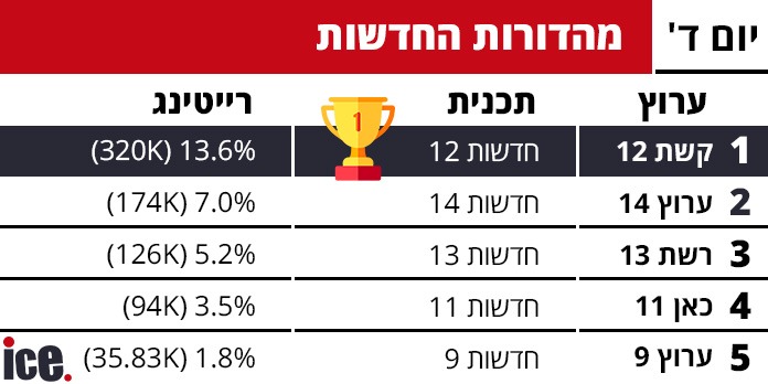מהדורת חדשות 12 המרכזית המשיכה לחזק את מעמדה כמהדורת החדשות הפופולרית ביותר בישראל, עם רייטינג של 13.6% המייצג 320 אלף צופים. הפער בין המובילה לבין המתחרות הראשיות נותר משמעותי - חדשות 14 השיגה 7% רייטינג עם 174 אלף צופים, וחדשות 13 הגיעה ל-5.2% רייטינג עם 126 אלף צופים. בזנב המהדורות נותרה חדשות 11 עם 3.5% רייטינג ו-94 אלף צופים בלבד. חדשות ערוץ 9 עם 1.8% ו-36 אלף צופים.
