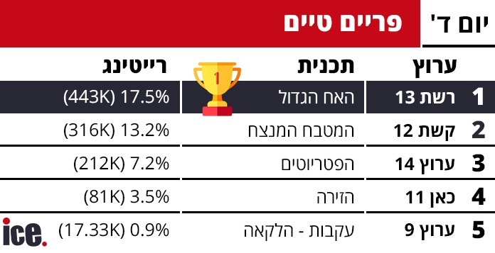 בשעות הפריים טיים, רשת 13 השיגה חזרה מרשימה עם "האח הגדול" שהוביל את הערב עם 17.5% רייטינג ו-443 אלף צופים. הצלחה זו מאירה באור חדש את המאבק בין הערוצים כאשר קשת 12 הגיעה למקום השני עם "המטבח המנצח VIP" שזכה ל-13.2% רייטינג ו-316 אלף צופים. ערוץ 14 הביא את "הפטריוטים" עם 7.2% רייטינג ו-211 אלף צופים, בעוד "פתחי את שי" באותו ערוץ רשם 5.5% רייטינג ו-134 אלף צופים.