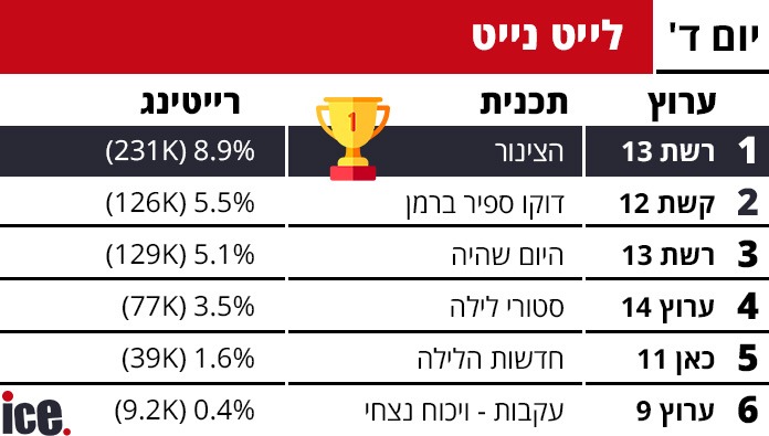 גם בשעות הלילה, רשת 13 המשיכה בהובלה עם "הצינור" שהשיג 8.9% רייטינג ו-231 אלף צופים. "היום שהיה" ברשת הוסיף 5.1% רייטינג ו-129 אלף צופים. קשת 12 הגיעה למקום השני עם דוקו ספיר ברמן שזכה ל-5.5% רייטינג ו-126 אלף צופים. ערוץ 14 סיים עם "סטורי לילה" ברייטינג של 3.5% ו-77 אלף צופים, בעוד כאן 11 נותרה בתחתית עם "חדשות הלילה" שהשיגה 1.6% רייטינג ו-39 אלף צופים בלבד. פרק נוסף של עקבות עם 0.4% בלבד.