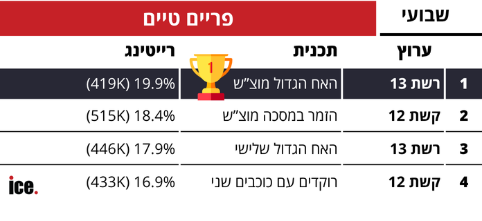 במקום השלישי של הדירוג השבועי בתוכנית מיום שלישי של האח הגדול - בו הייתה השבוע דרמה גדולה מצד דיירים - לקח 17.9% ו-446 אלף צופים, וגם רוקדים עם כוכבים שלחה נציגות לרשימה השבועית עם 16.9% יחד עם 433 אלף צופים.