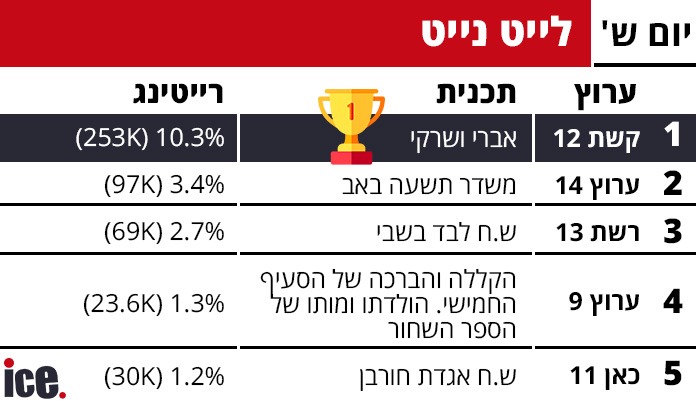 ברצועת הלייט, קשת 12 המשיכה לשלוט עם התכנית "אברי ושרקי" שזכתה לרייטינג מכובד של 10.3% ו-253 אלף צופים. רשת 13 הציגה את "ש.ח לבד בשבי" עם 2.7% ו-69 אלף צופים, בעוד כאן 11 הסתפקה ב-1.2% ו-30 אלף צופים עבור "ש.ח אגדת חורבן". חדשות 14 שידרה "משדר תשעה באב" שהגיע ל-3.4% ו-97 אלף צופים.