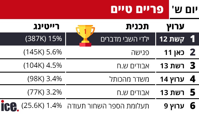 ברצועת הפריים טיים, קשת 12 הממשיכה להוביל בביטחון עם התכנית "ילדי השבי מדברים" שזכתה לרייטינג יוצא דופן של 15% ו-378 אלף צופים. רשת 13 הציגה שני פרקים של "ש.ח אבודים" עם תוצאות משתנות - הפרק הראשון הגיע ל-3.2% ו-77 אלף צופים, בעוד השני השיג 4.5% ו-104 אלף צופים. כאן 11 השיגה תוצאות מעורבות: "פגישה" זכתה ל-5.6% ו-145 אלף צופים, אך "מפלגת המחשבות" הסתפקה ב-1.6% ו-47 אלף צופים בלבד. חדשות 14 סיימה עם "מהדורת מוצ״ש" שהגיעה ל-4.7% ו-113 אלף צופים.
