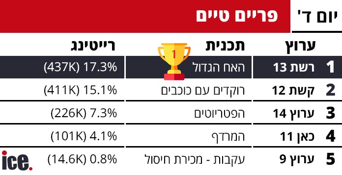 רצועת הפריים טיים מציגה תמונה מעניינת של התחרות הקשה כאשר "האח הגדול" ברשת 13 מוביל בביטחון עם 17.3% רייטינג ו-437 אלף צופים, ועוקף את "רוקדים עם כוכבים" של קשת 12 שזוכה ל-15.1% רייטינג ו-411 אלף צופים. ערוץ 14 מתמודד בכבוד עם "הפטריוטים" שמשיג 7.3% רייטינג ו-226 אלף צופים, ואחריו "פתחי את שי" ב-3.8% ו-134 אלף צופים. כאן 11 נותר מאחור עם "המרדף" ב-4.1% ו-101 אלף צופים, ו"קחו מספר" ב-2.8% ו-69 אלף צופים.